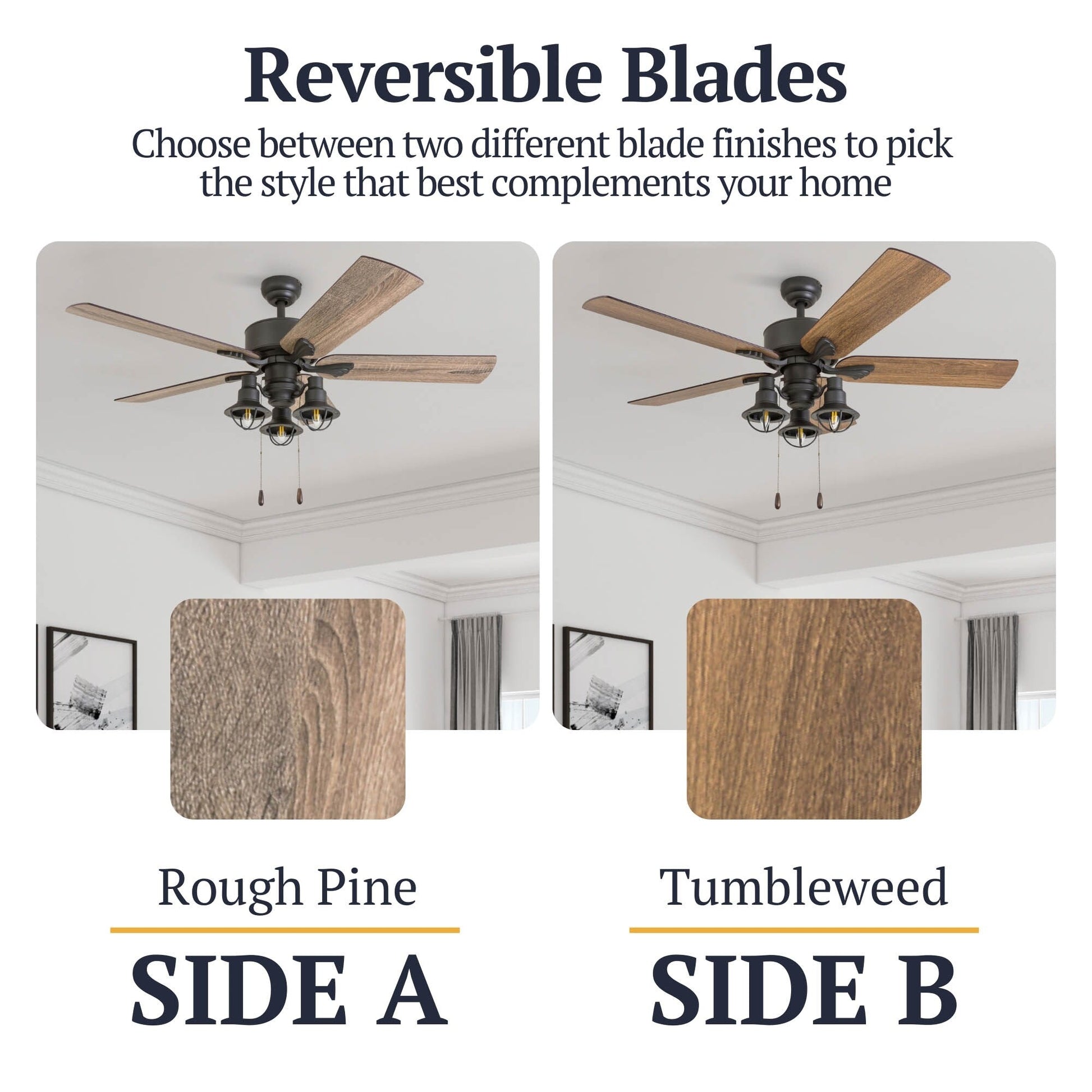 - Barnwood finish on wooden blades