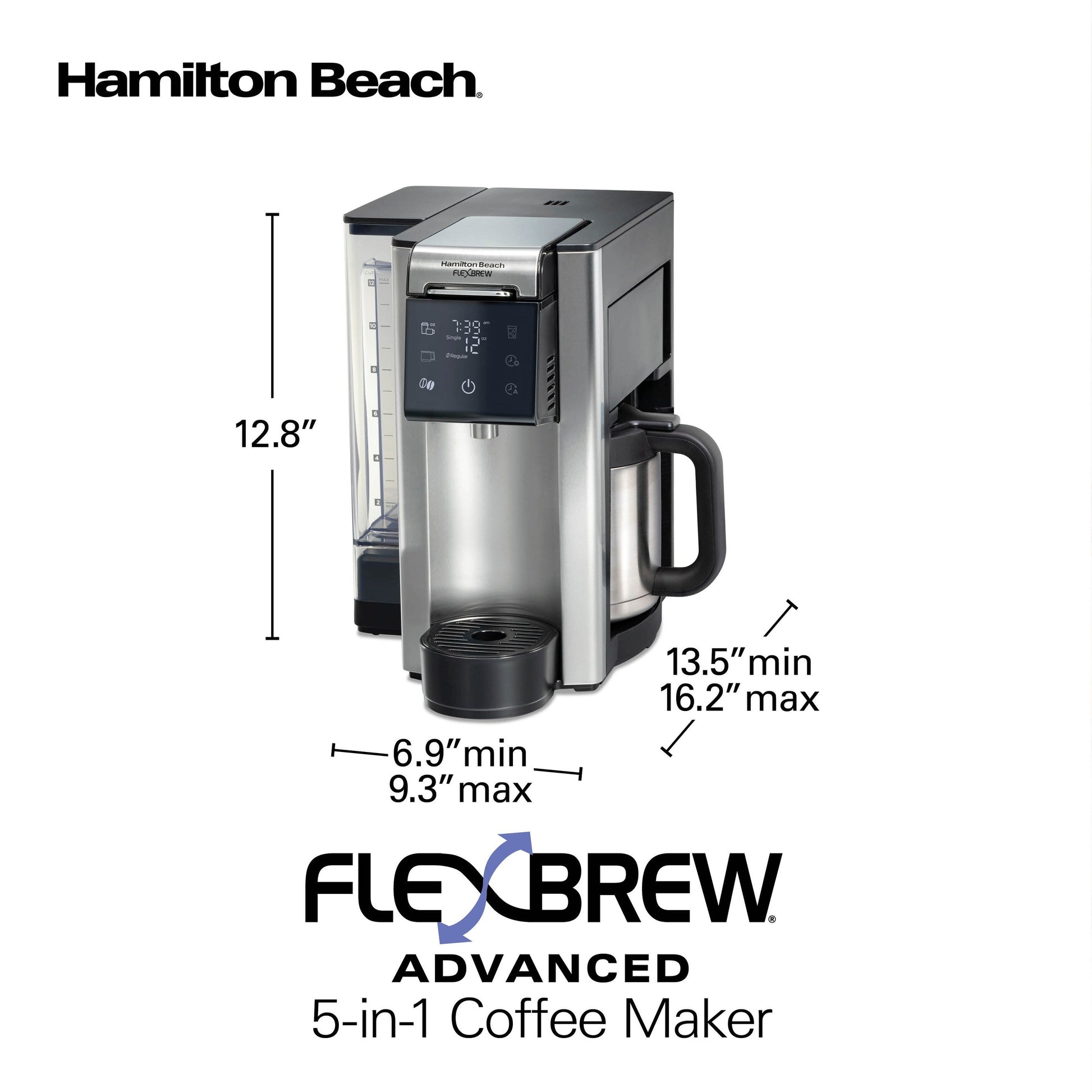 Brew a quick cup of coffee on busy mornings or make a whole carafe when you have more time. The Hamilton Beach® FlexBrew® Advanced 5-in-1 Coffee Maker fits every brewing preference and schedule, whether you want an iced or hot single cup or a whole carafe of hot coffee. Brew a travel mug or regular cup with a K-Cup®* pods or ground coffee. Enjoy multiple servings made with ground coffee in the 12 cup thermal carafe. No matter how you brew, the large 60 oz. removable water reservoir needs fewer refills, and has dual-position flexibility to fit on the back or side. Place it on the back for a space-saving design that's over 40% narrower** or place it on the side for easy access and fast refilling. Features an easy-to-use LED touchscreen with multiple brewing options and auto shutoff. Includes 12 cup stainless steel thermal carafe, 60 oz. removable water reservoir, pod holder and brew basket for single-serve ground coffee.