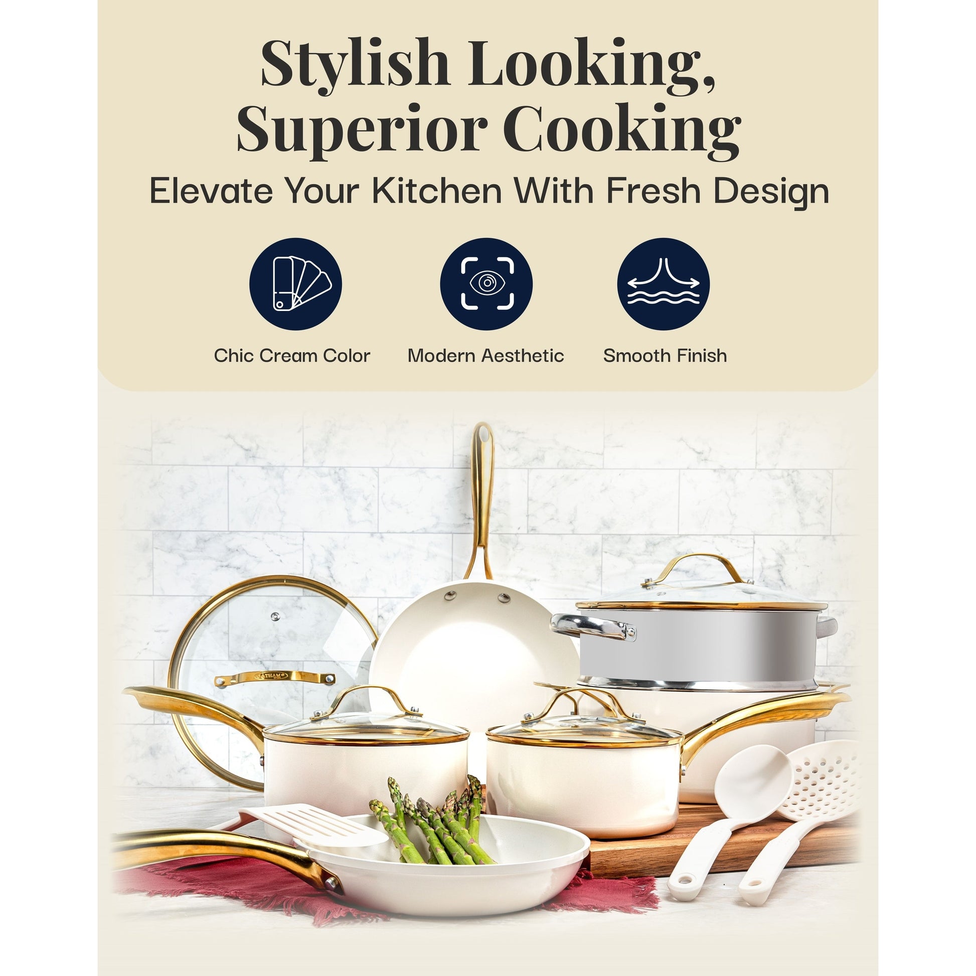 Gotham Steel Cream Pots and Pans 15 Piece Ultra Nonstick Ceramic Cookware Set with Utensils