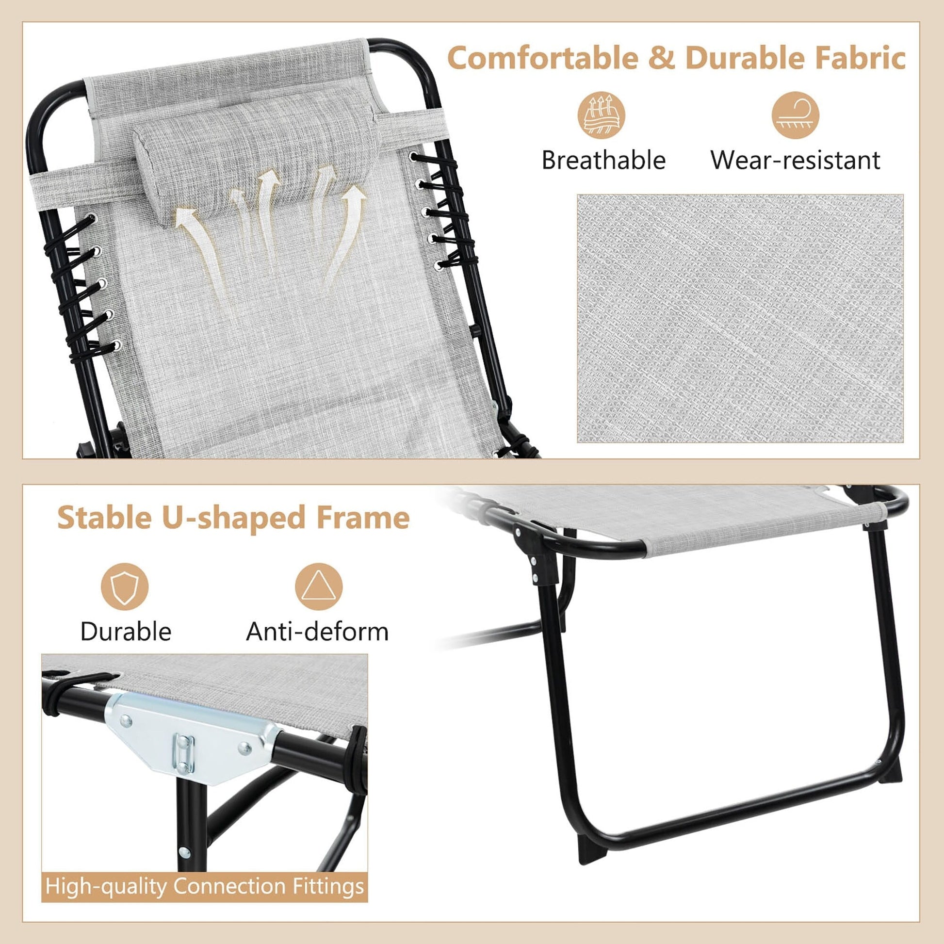 Made of high-quality steel material, our lounge chair is pretty sturdy. It has high load-bearing capacity and can hold up to 265 lbs. Additionally, the delta lock system allows you to lock the back of the chair in different positions. You can easily adjust the tilt angle of pedal and backrest in order to meet diverse requirements. And it is ergonomically designed to reduce muscle tension and stress. The additional pillow can provide your neck with great support. It is suitable for outdoor usage because of its weather-resistant design. Users can use it in beach, backyard, gardens and lawn freely.