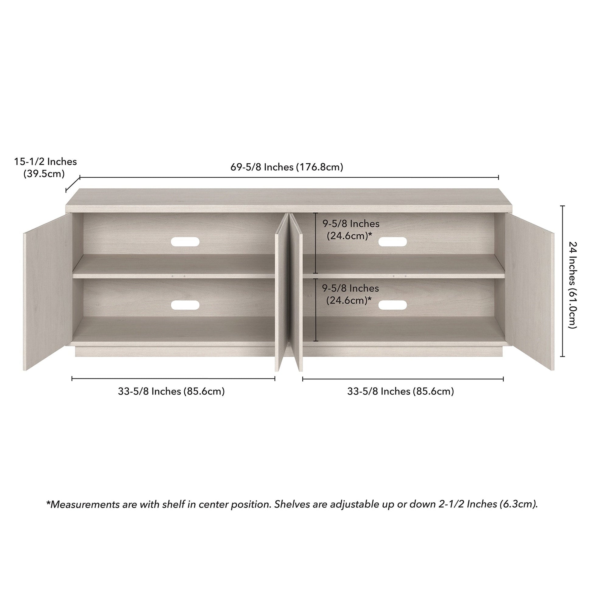 - Features four doors with enclosed cabinets and 4 shelves for ample storage.