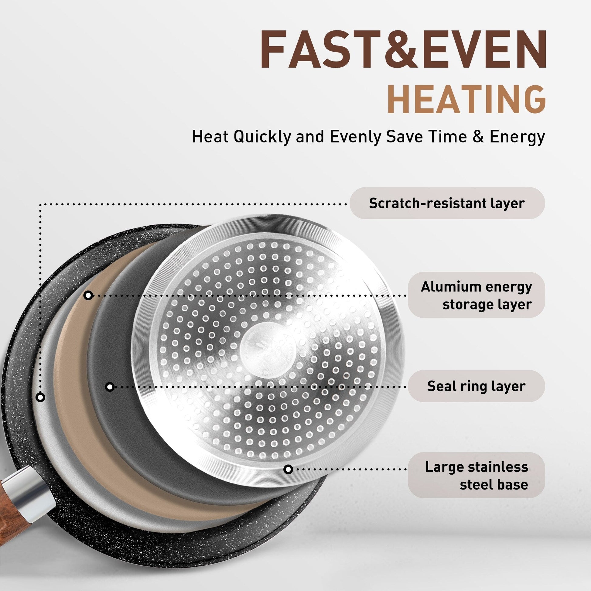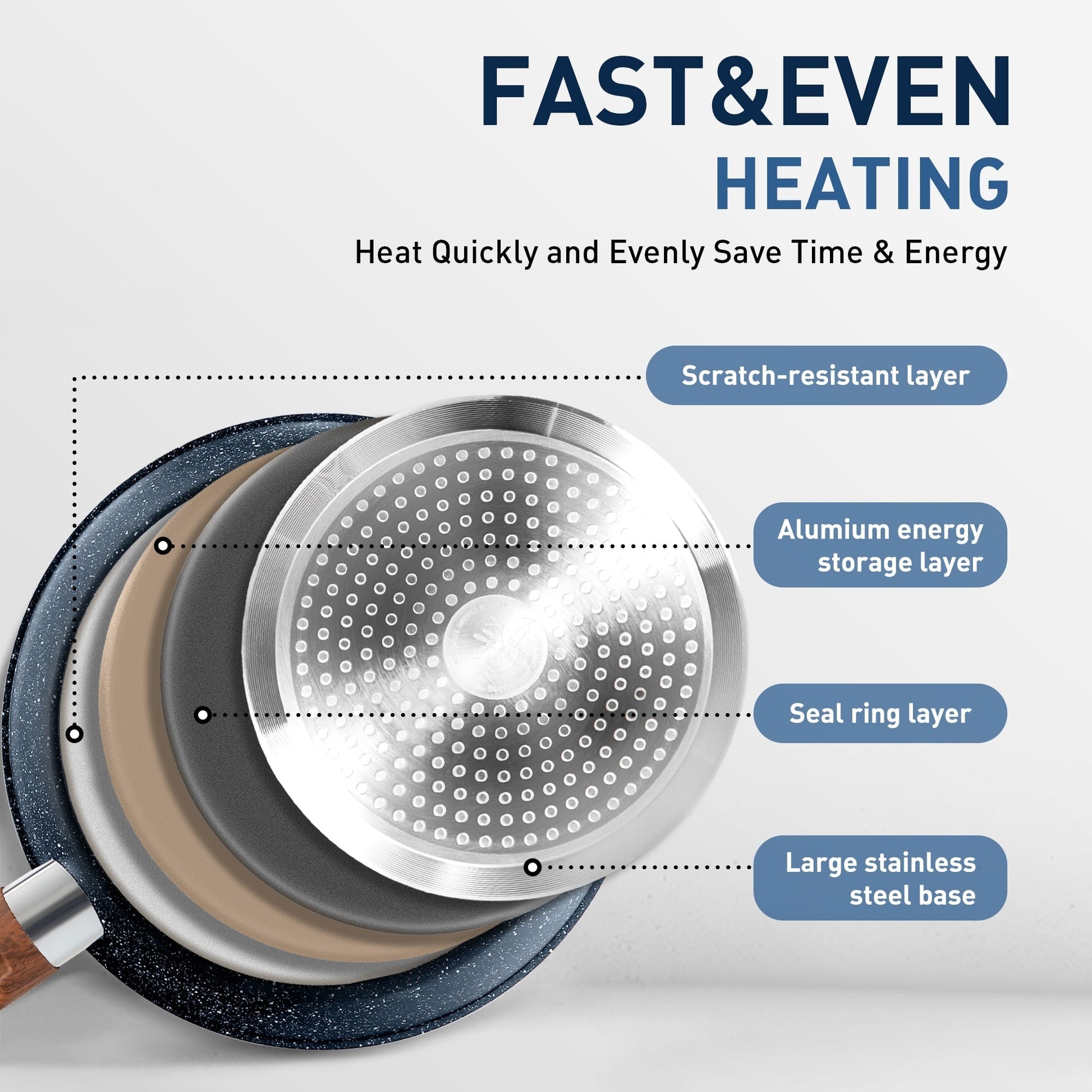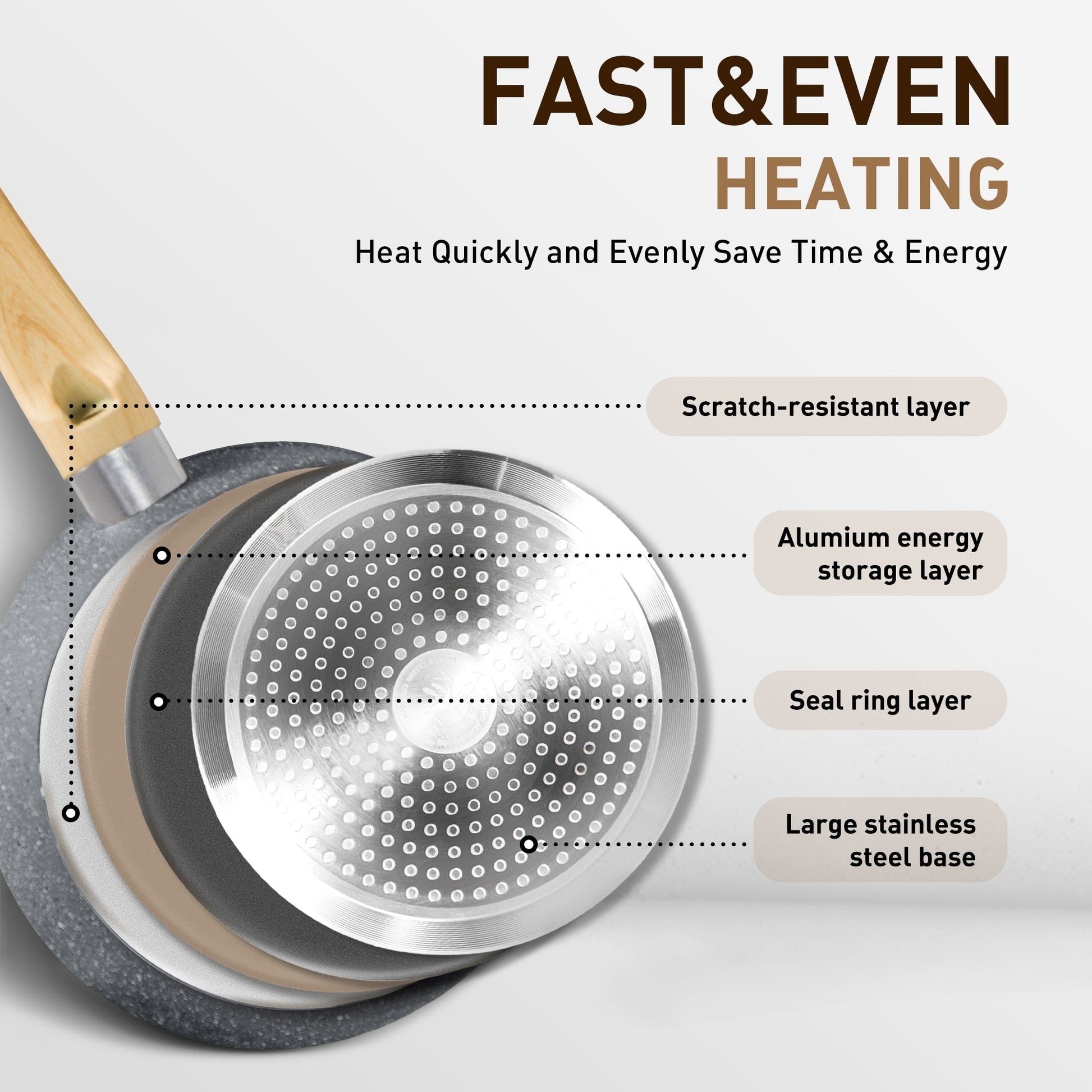 Cook up a storm with the Kitchen Academy Nonstick Granite-Coated Cookware Set. Each piece is designed with forged aluminum bottoms for even heating on all stovetops, including induction. The triple food-grade granite exteriors provide exceptional durability and warp resistance, while the natural marble-coated interiors make cooking and cleaning easy. The wood-look bakelite handles add a touch of style to this versatile set.