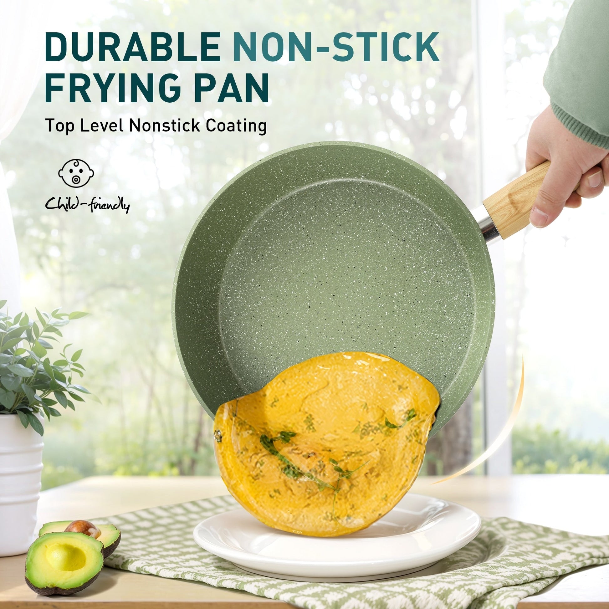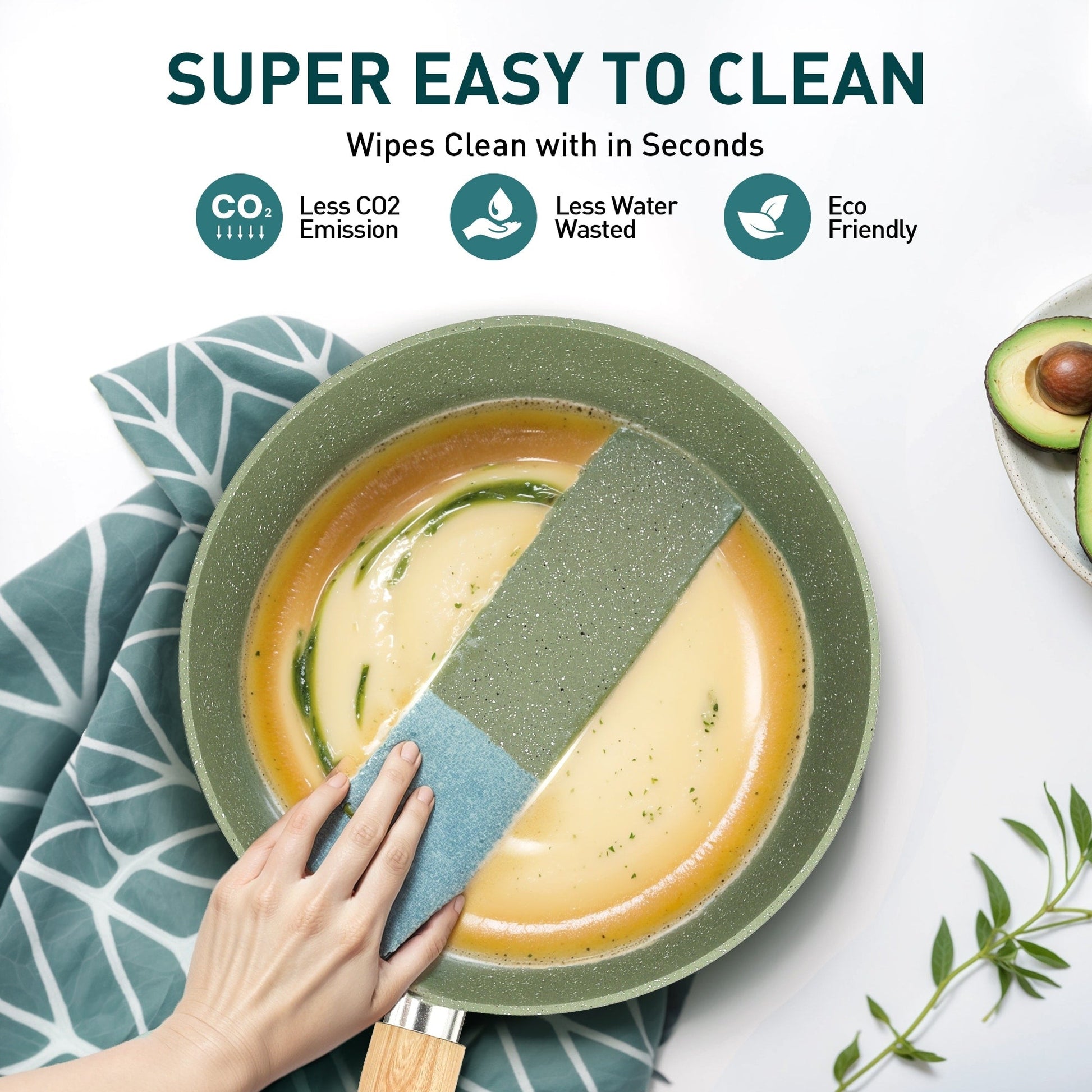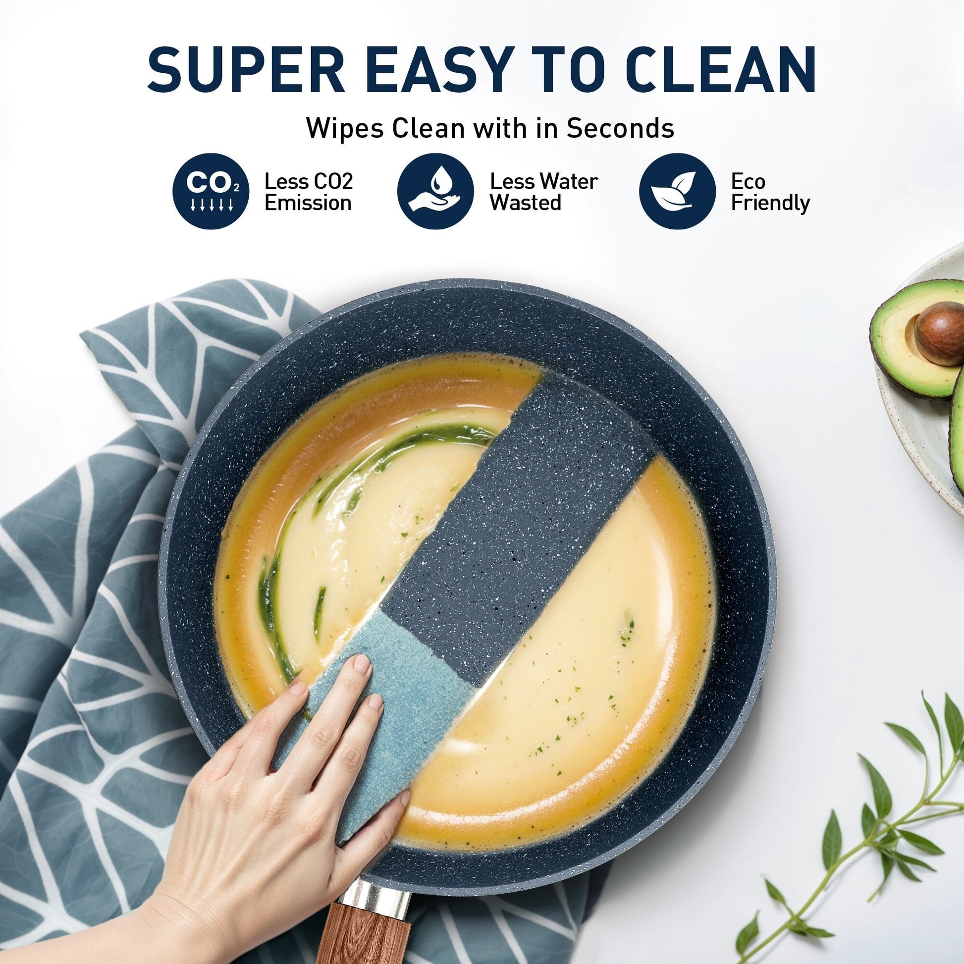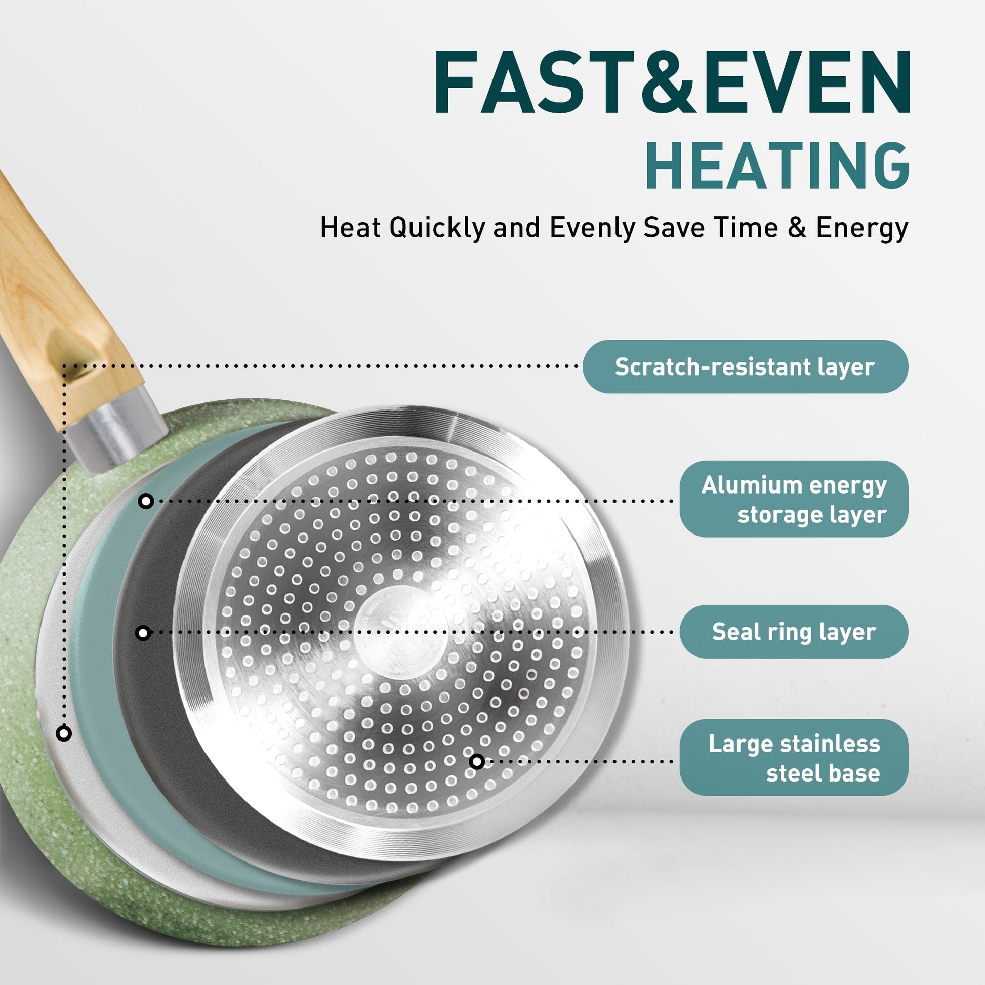 Cook up a storm with the Kitchen Academy Nonstick Granite-Coated Cookware Set. Each piece is designed with forged aluminum bottoms for even heating on all stovetops, including induction. The triple food-grade granite exteriors provide exceptional durability and warp resistance, while the natural marble-coated interiors make cooking and cleaning easy. The wood-look bakelite handles add a touch of style to this versatile set.