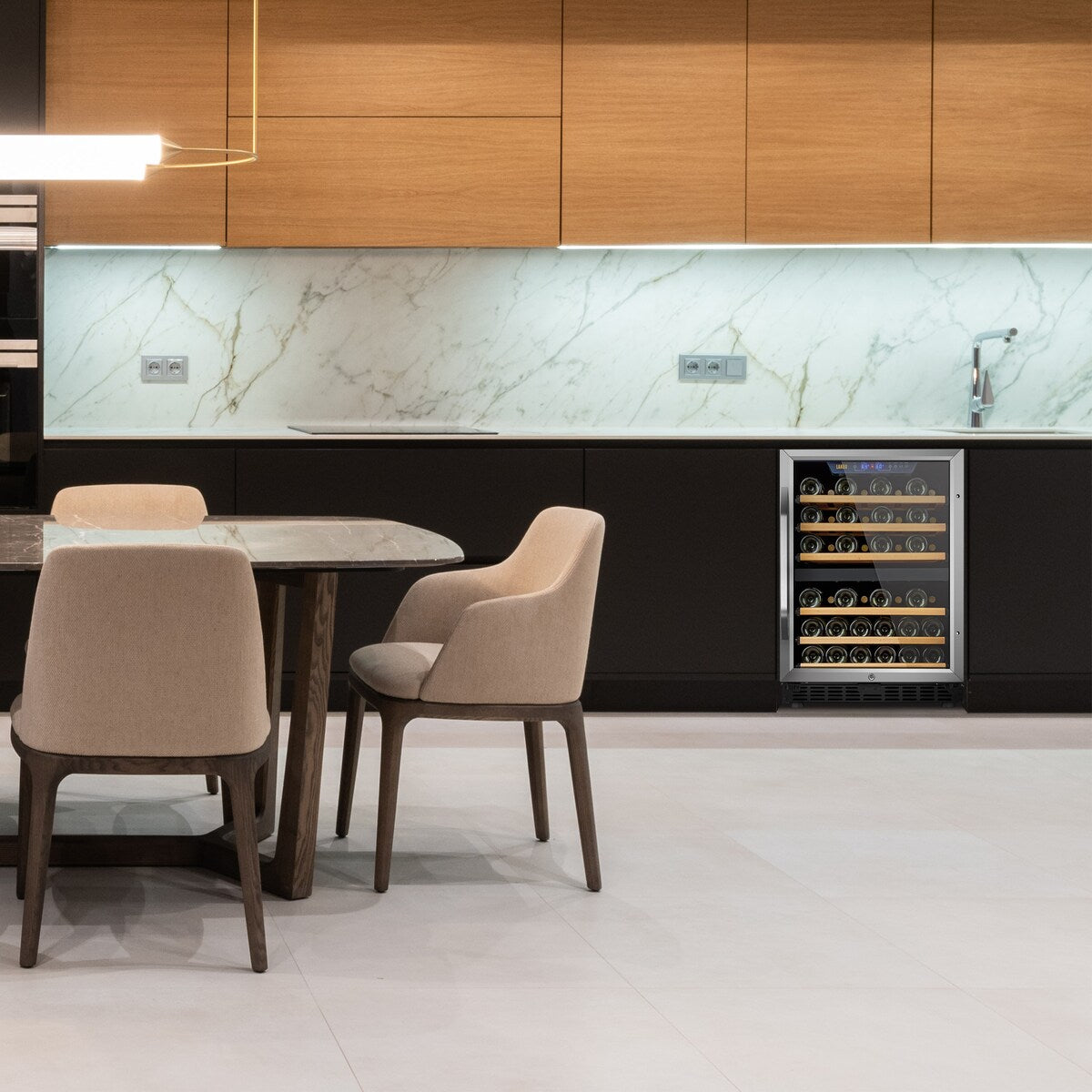 Add a touch of elegance to your kitchen with this Lanbo 24 Inch Built-in Dual Zone Compressor Wine Cooler, capable of storing up to 44 standard Bordeaux bottles. With its two temperature-controlled zones, you can keep your white and red wines at the ideal temperature for maximum enjoyment. The UV-protected double-pane tempered glass door and auto LED lighting make it easy to find the bottle you want. Plus, the compressor fan cooling and beech wooden shelves ensure your wine stays fresh and flavorful.