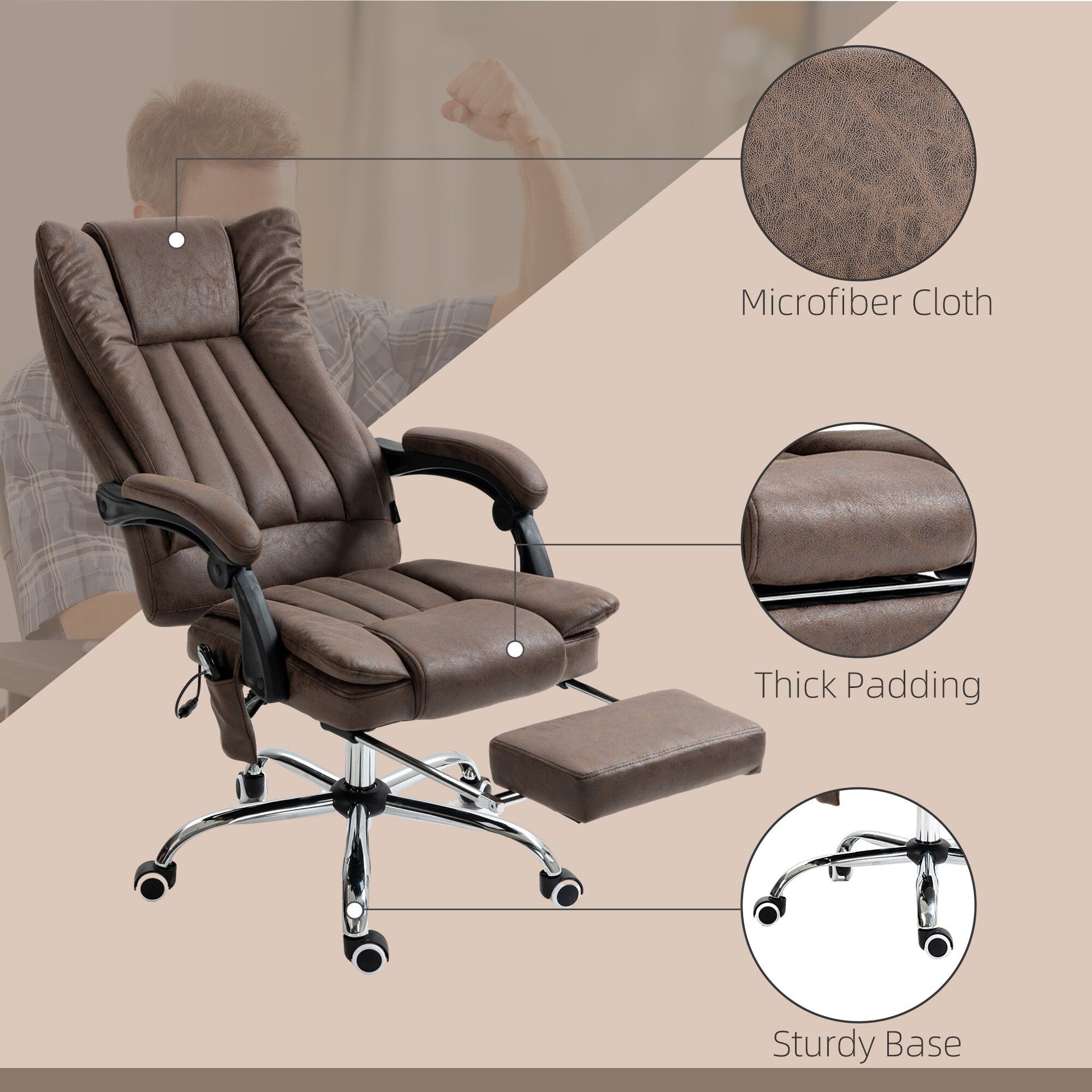 - Unwind after a long day with this microfiber massage office chair, featuring six vibration points and three heat settings across the back, waist, and thighs. Designed for both comfort and function, it includes a reclining back, adjustable height, retractable footrest, and intuitive remote control. The padded design and soft-touch fabric add support and relaxation for daily use at home or in the office.