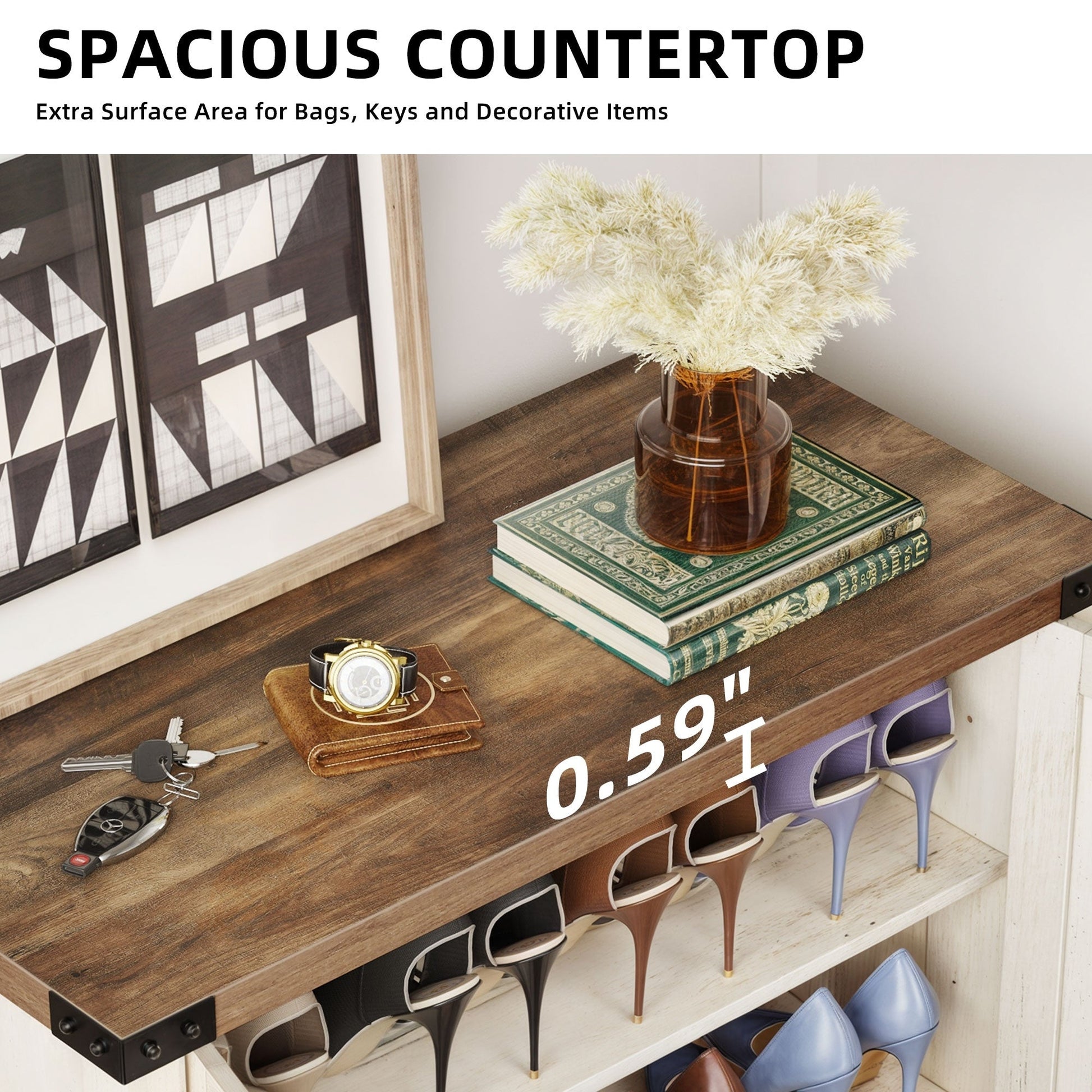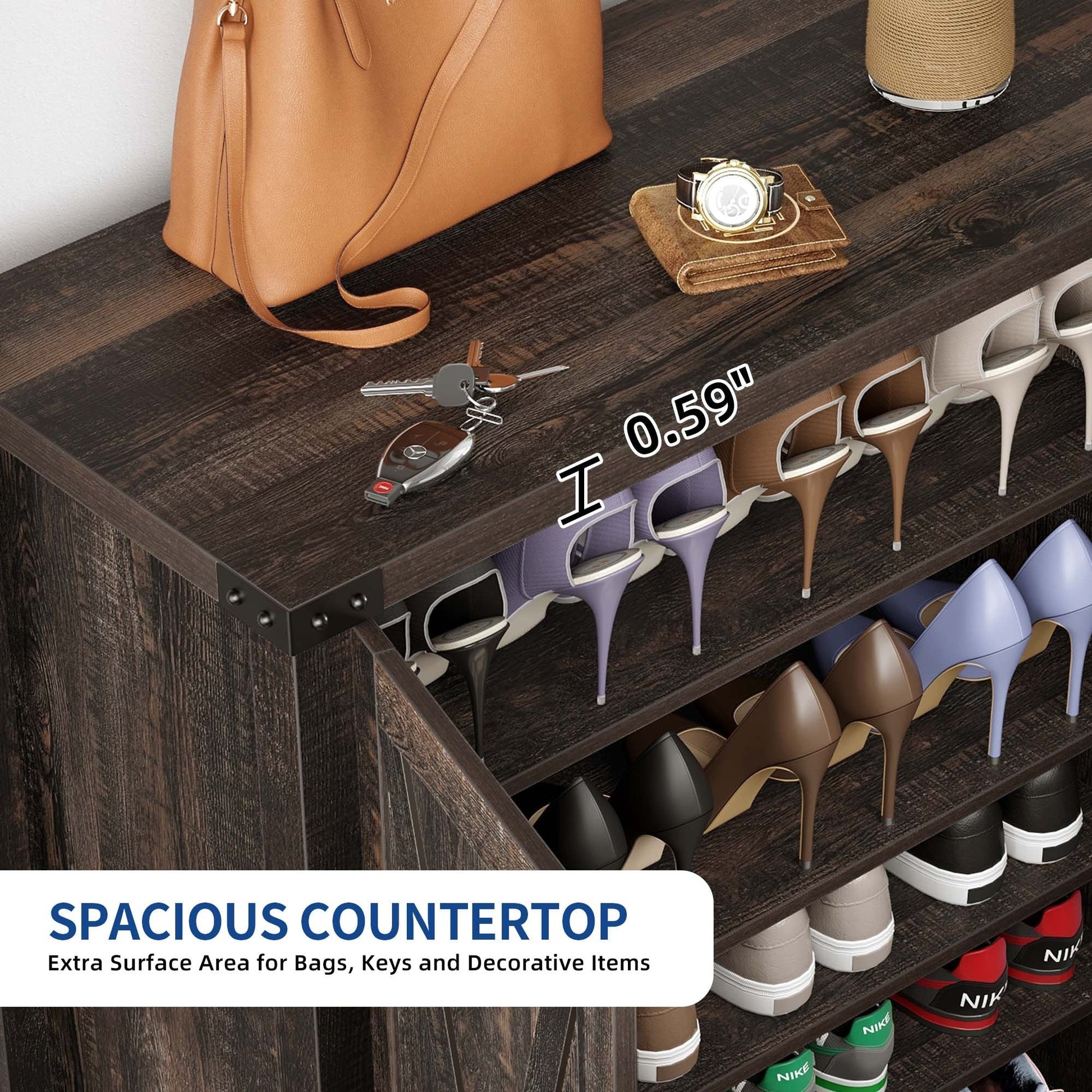 - Large storage space accommodates 15-20 pairs of shoes and small items.