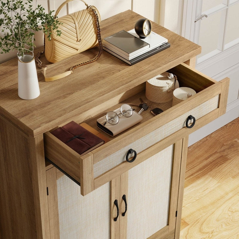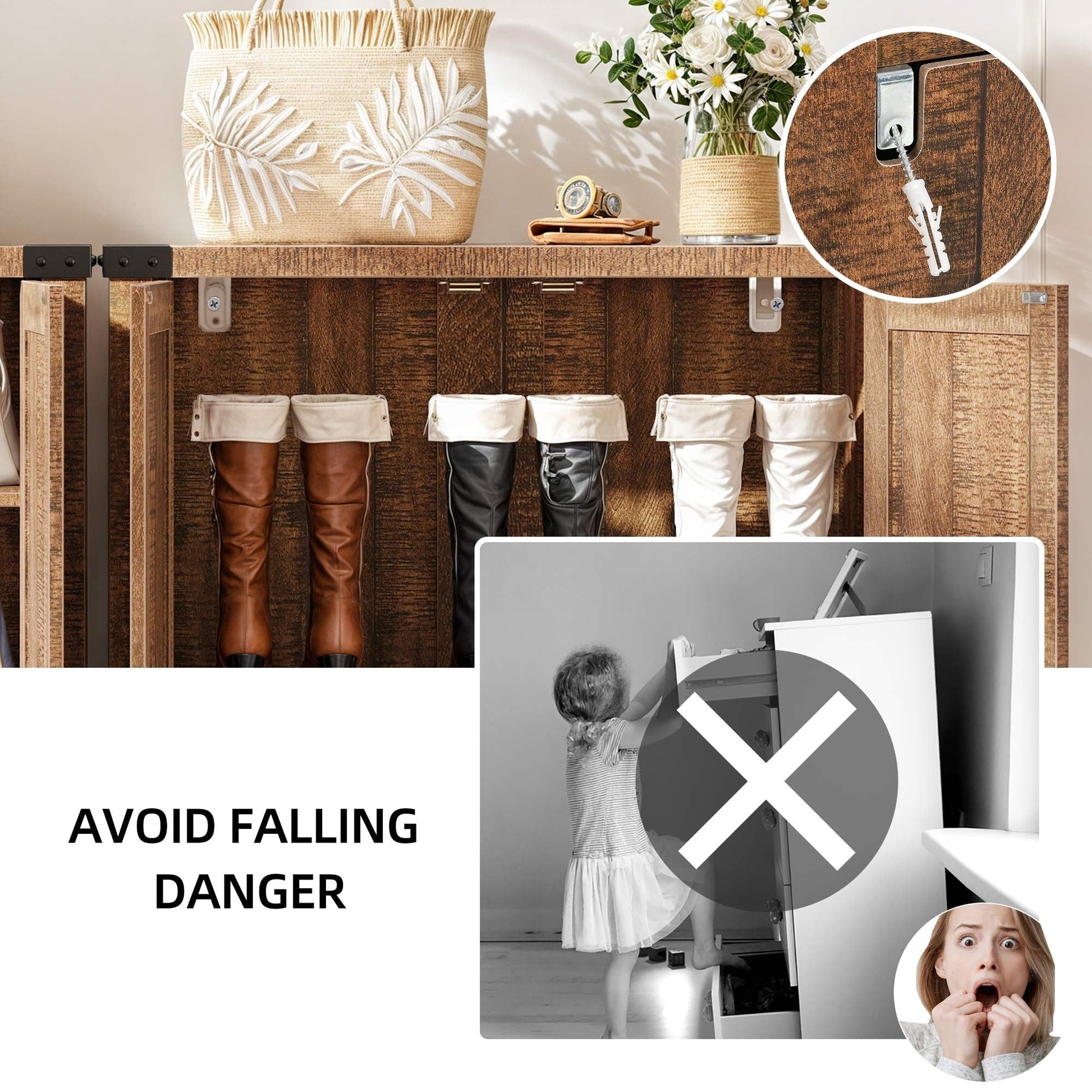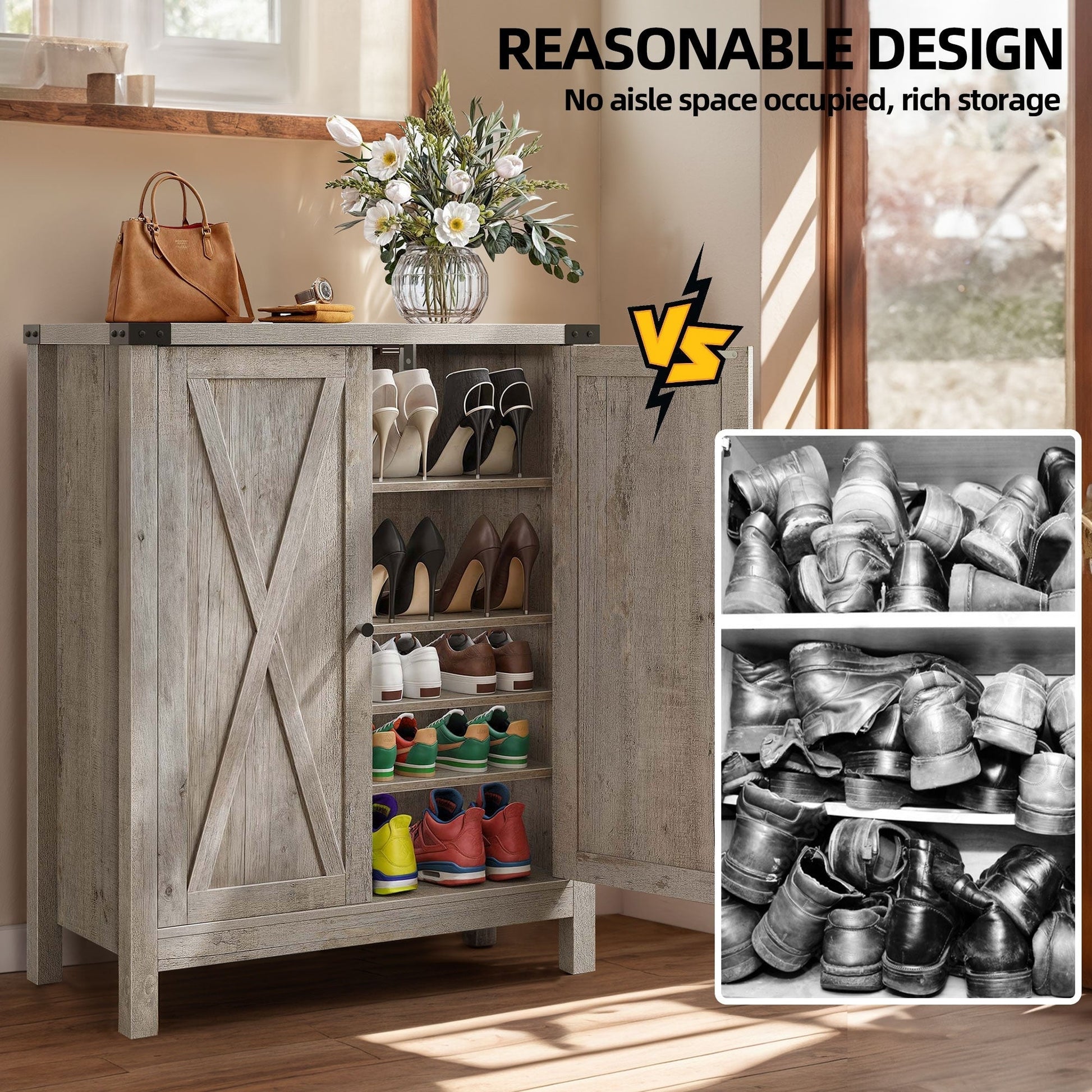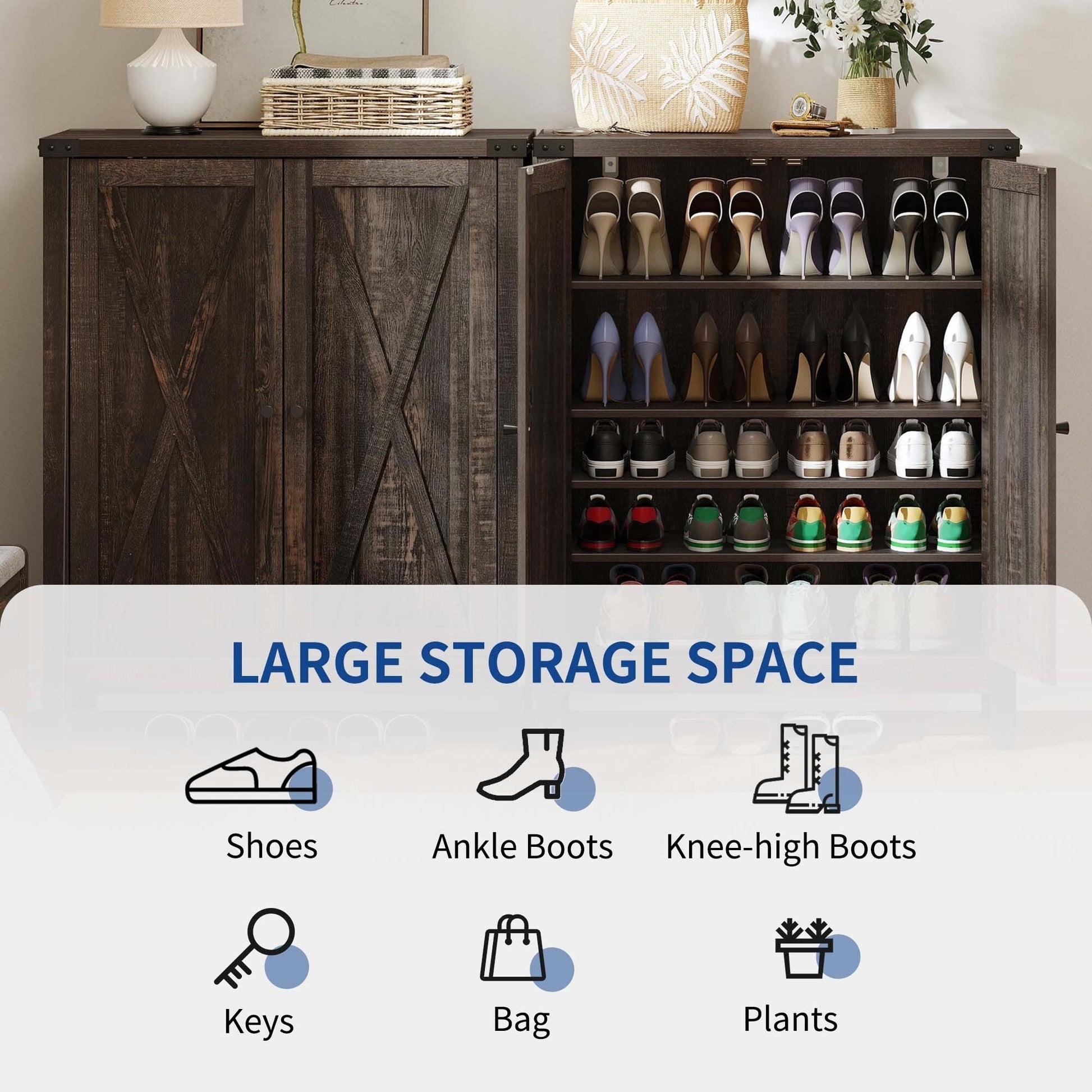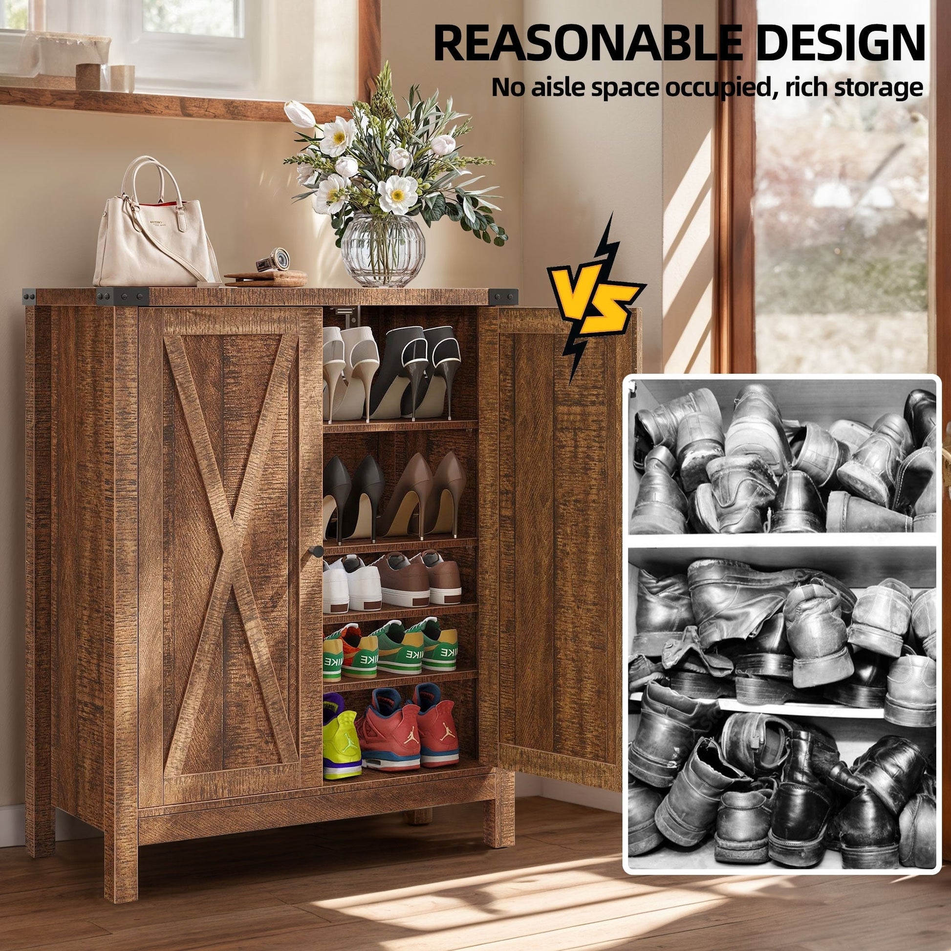 Step into organization with our spacious Shoe Cabinet. With 5 shelves that can accommodate 15-20 pairs of shoes, and a handy top for small items, it's a must-have for any home. The cabinet's exquisite X pattern adds a touch of farmhouse charm, while the adjustable 1st and 3rd shelves accommodate all types of footwear. Crafted from durable MDF with sturdy wooden legs, it's designed for stability and longevity. Remember to install the included anti-tip kit for safety.