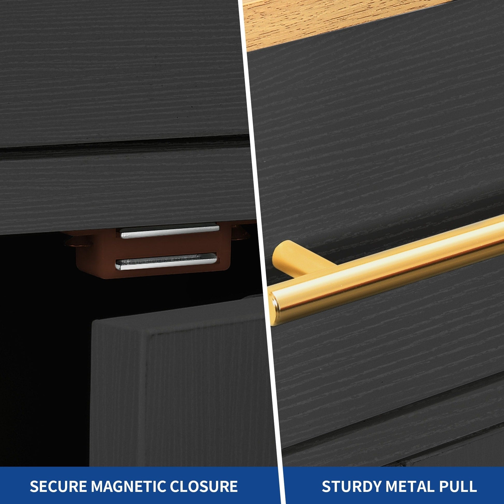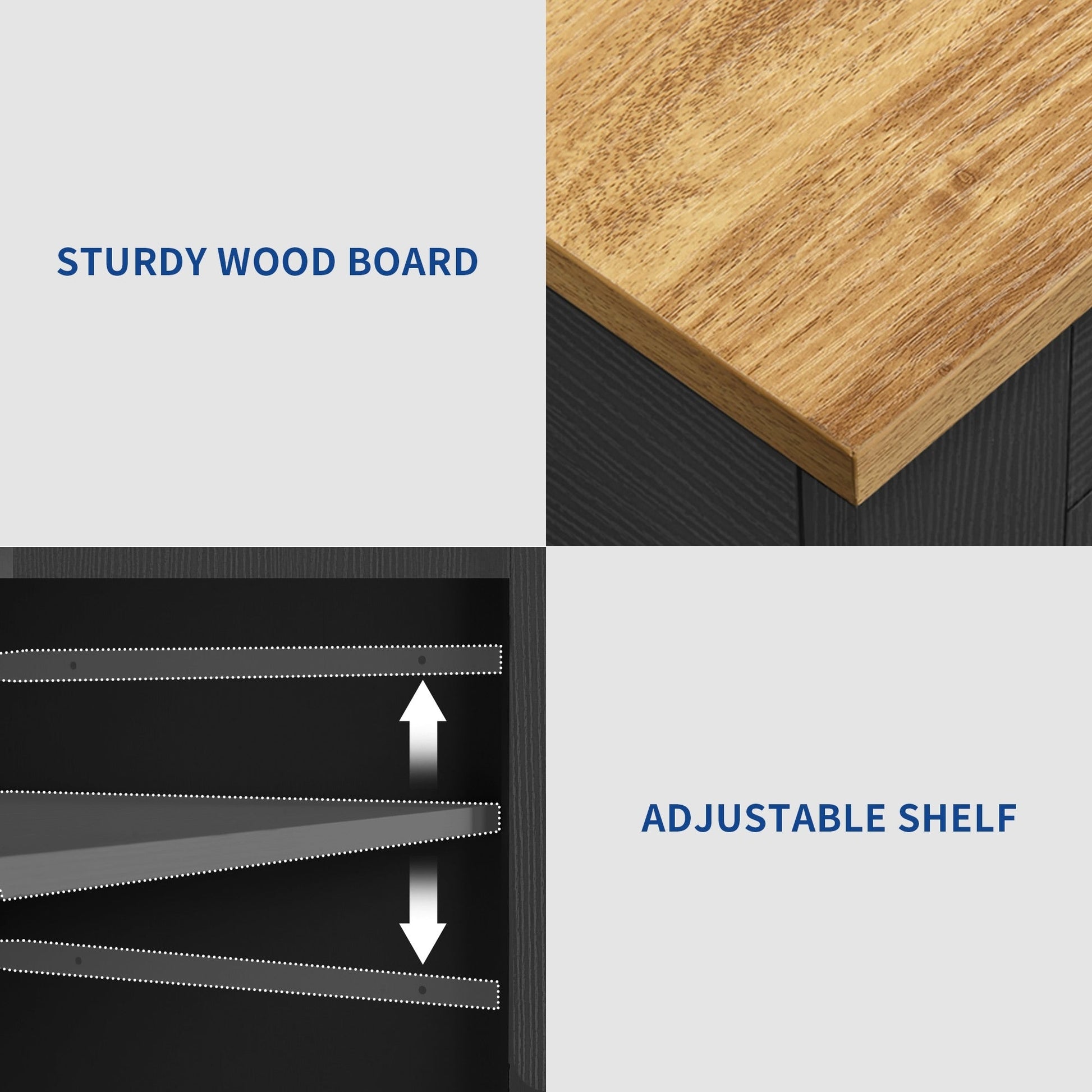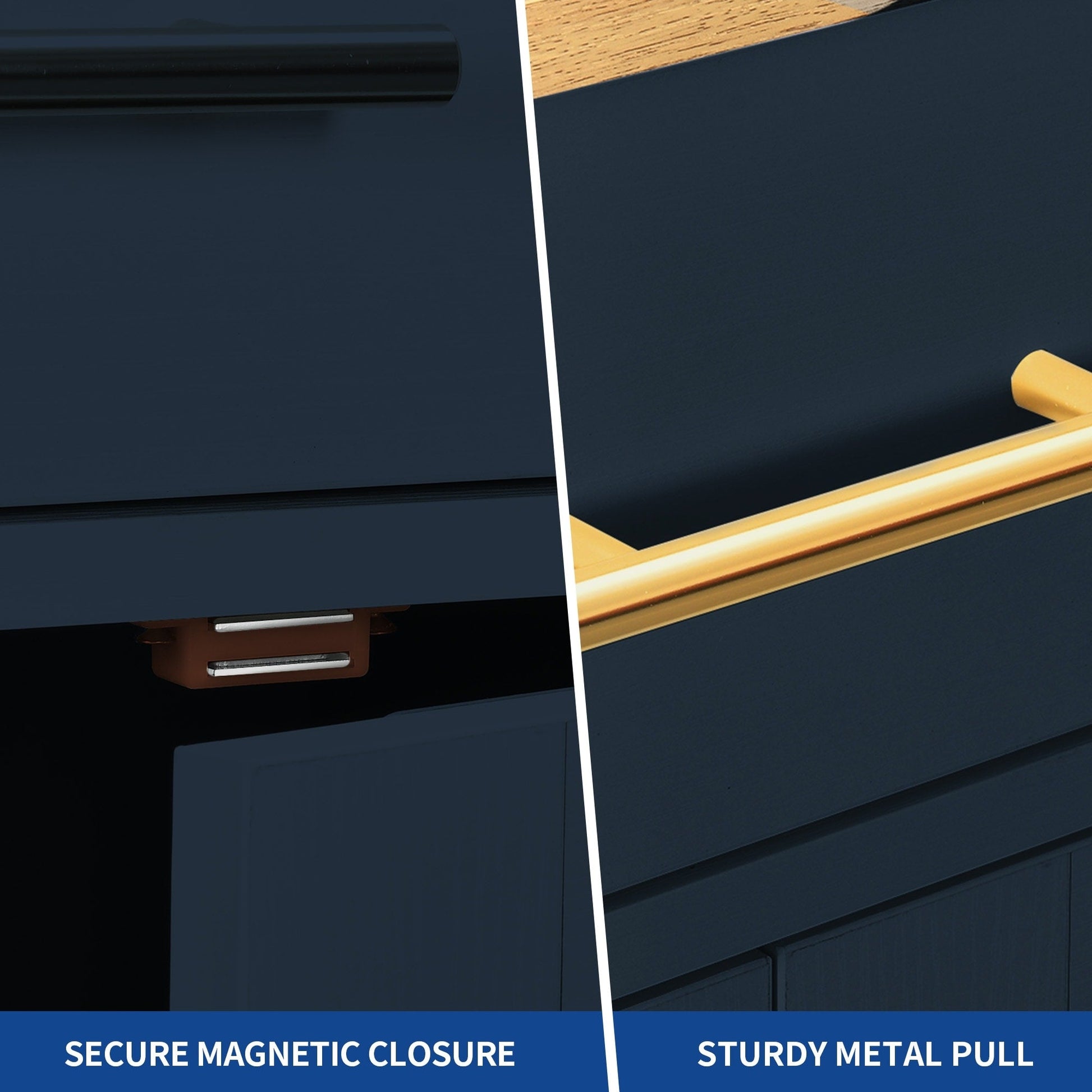 Check out our tilt-out trash can cabinet! This essential addition to your kitchen island helps keep your kitchen and dining area clean and fresh by securely storing a 10-gallon trash can (not included) to prevent odors. It provides ample storage space with 2 drawers for utensils, dinnerware, and stationery, and 3 side open shelves for spices. The adjustable shelf inside the cabinet can accommodate various kitchen items. This versatile cart comes with lockable rolling wheels for easy movement and locking for food prep or storage. Ideal for kitchens, dining rooms, and restaurants, this cabinet is made of safe CARB phase Ⅱ certified MDF boards. Assembly is simple with clear instructions.