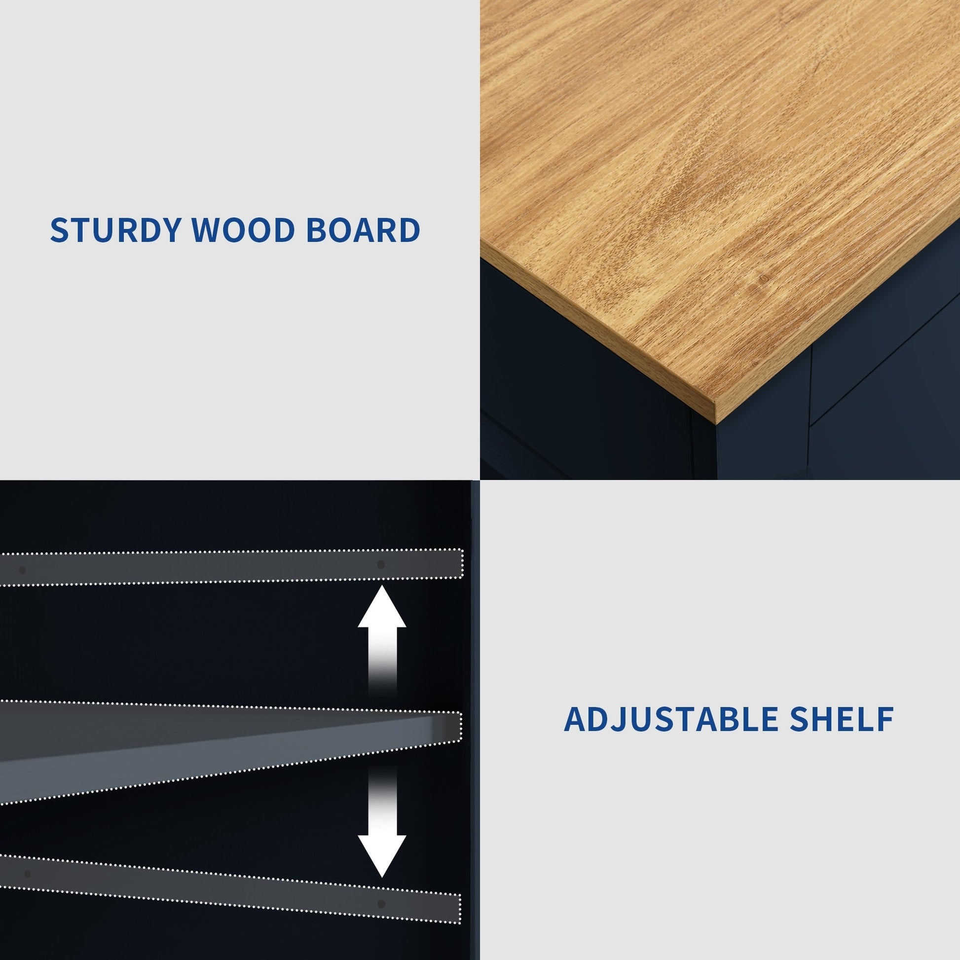 - Includes 2 drawers and 3 shelves for organized kitchen storage.