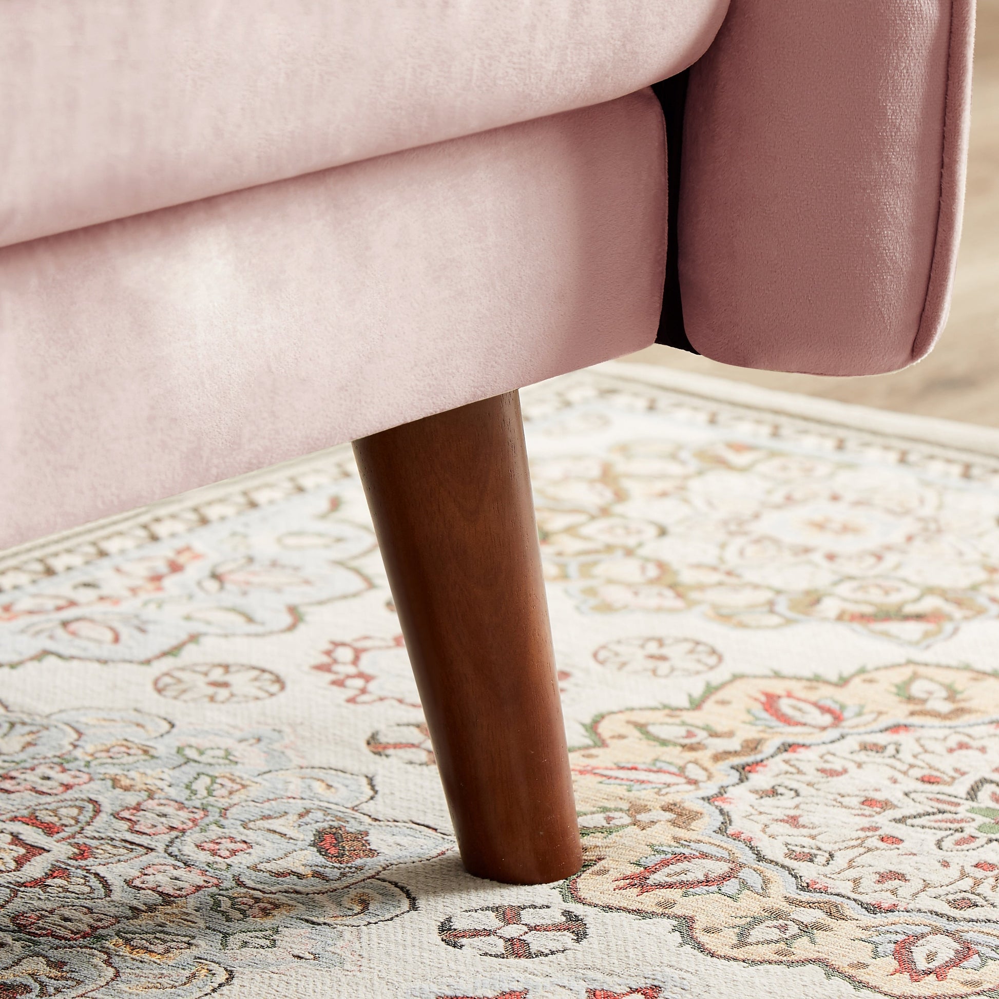 - Solid wood legs and brass rivets for an elegant touch