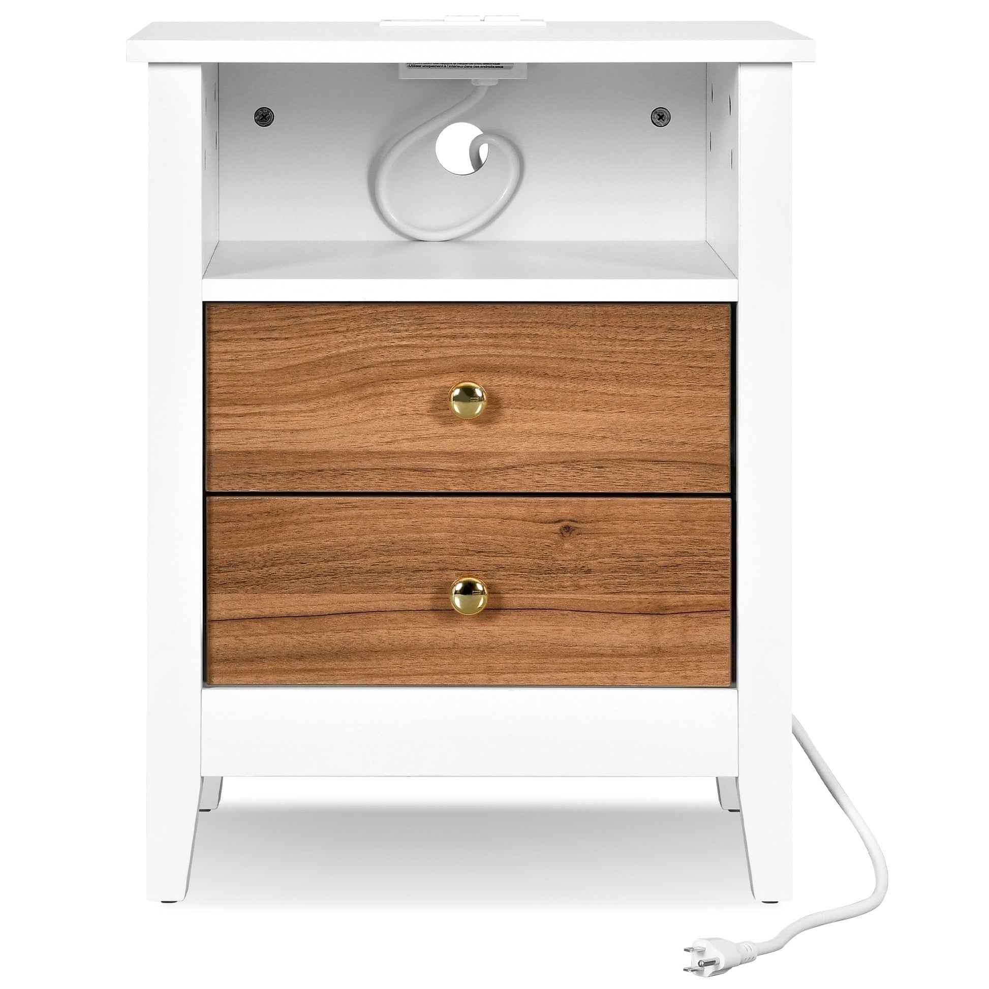 - 1.Enjoy the stylish and unique look of this nightstand that features white panels and golden round handles that match most room decors. It creates a cozy reading atmosphere at night