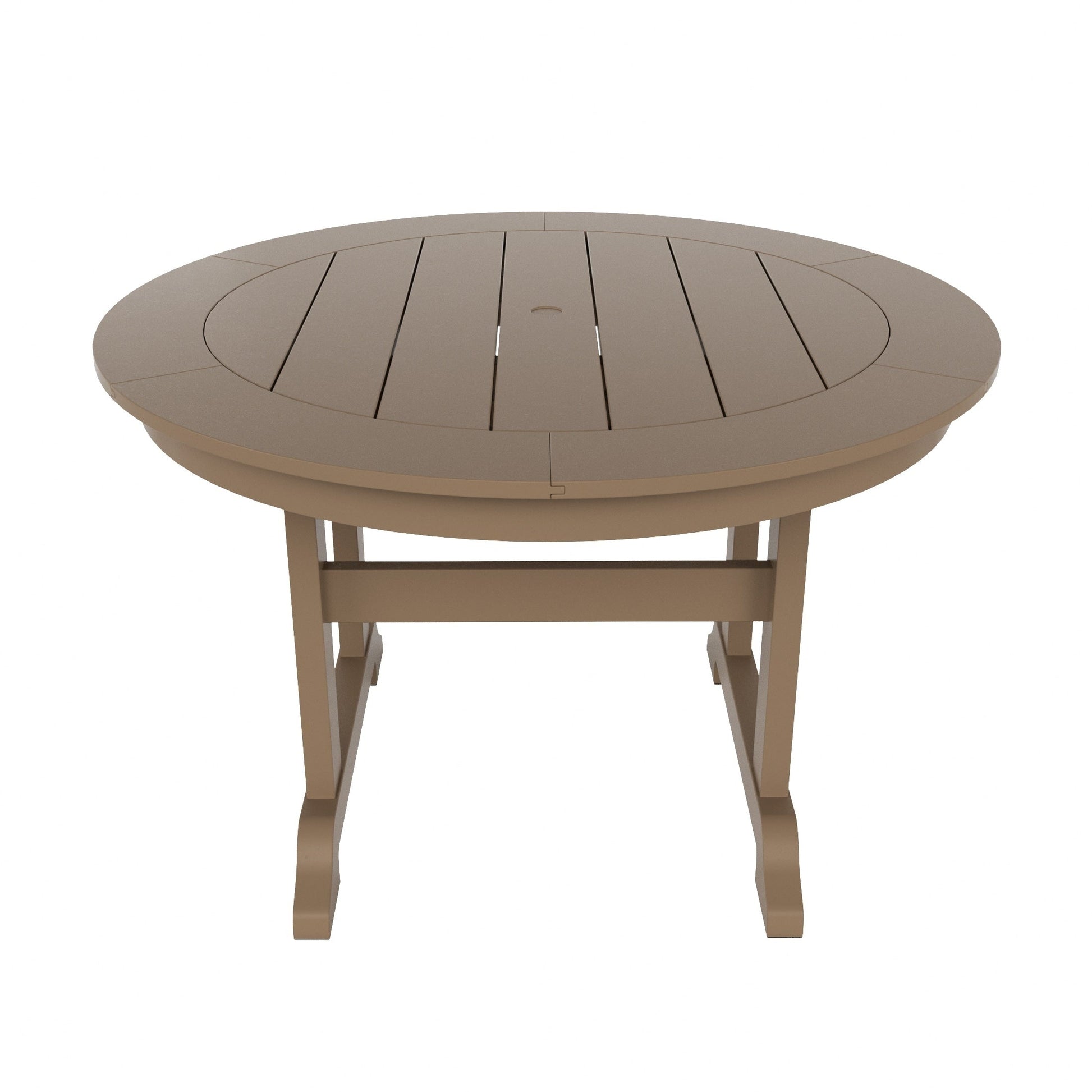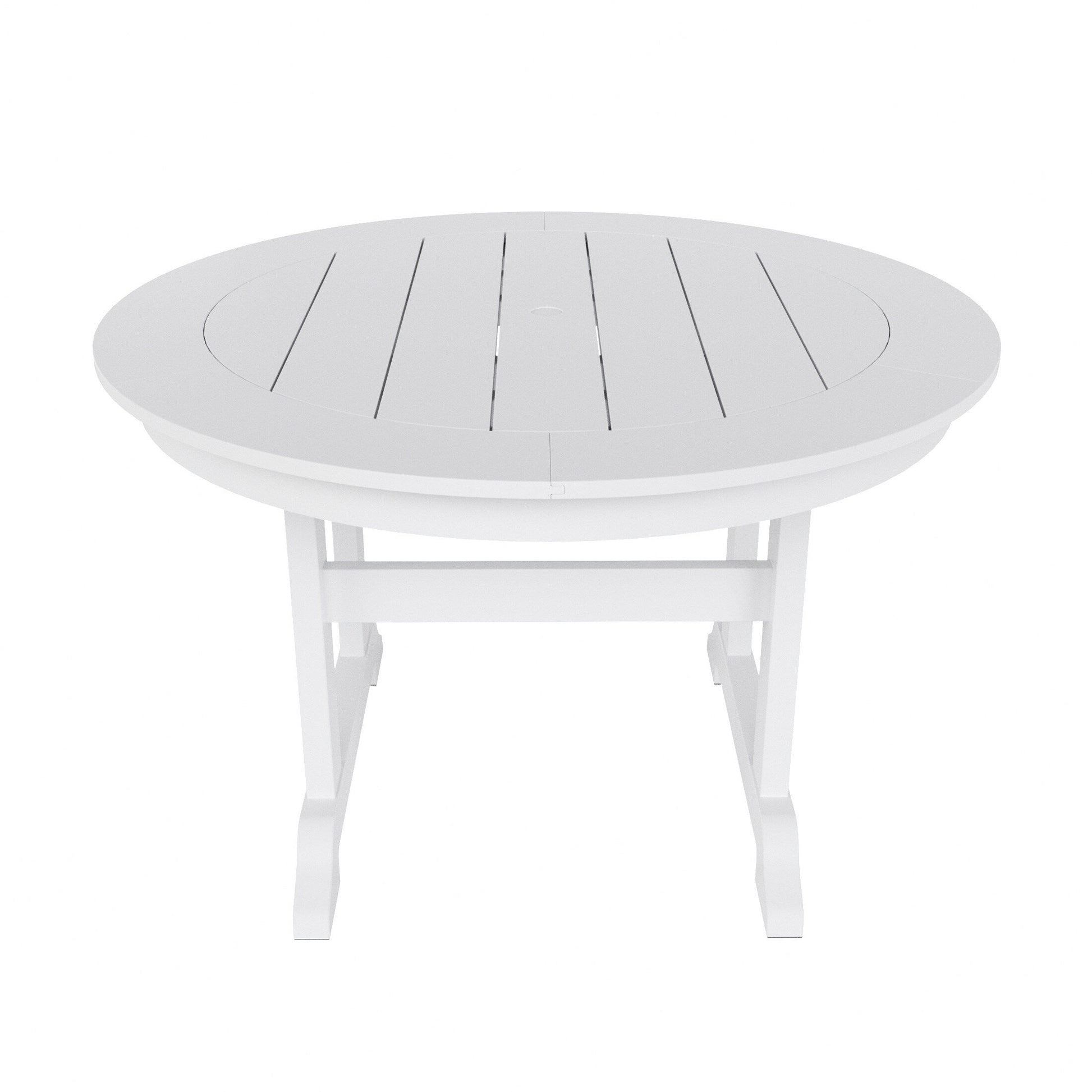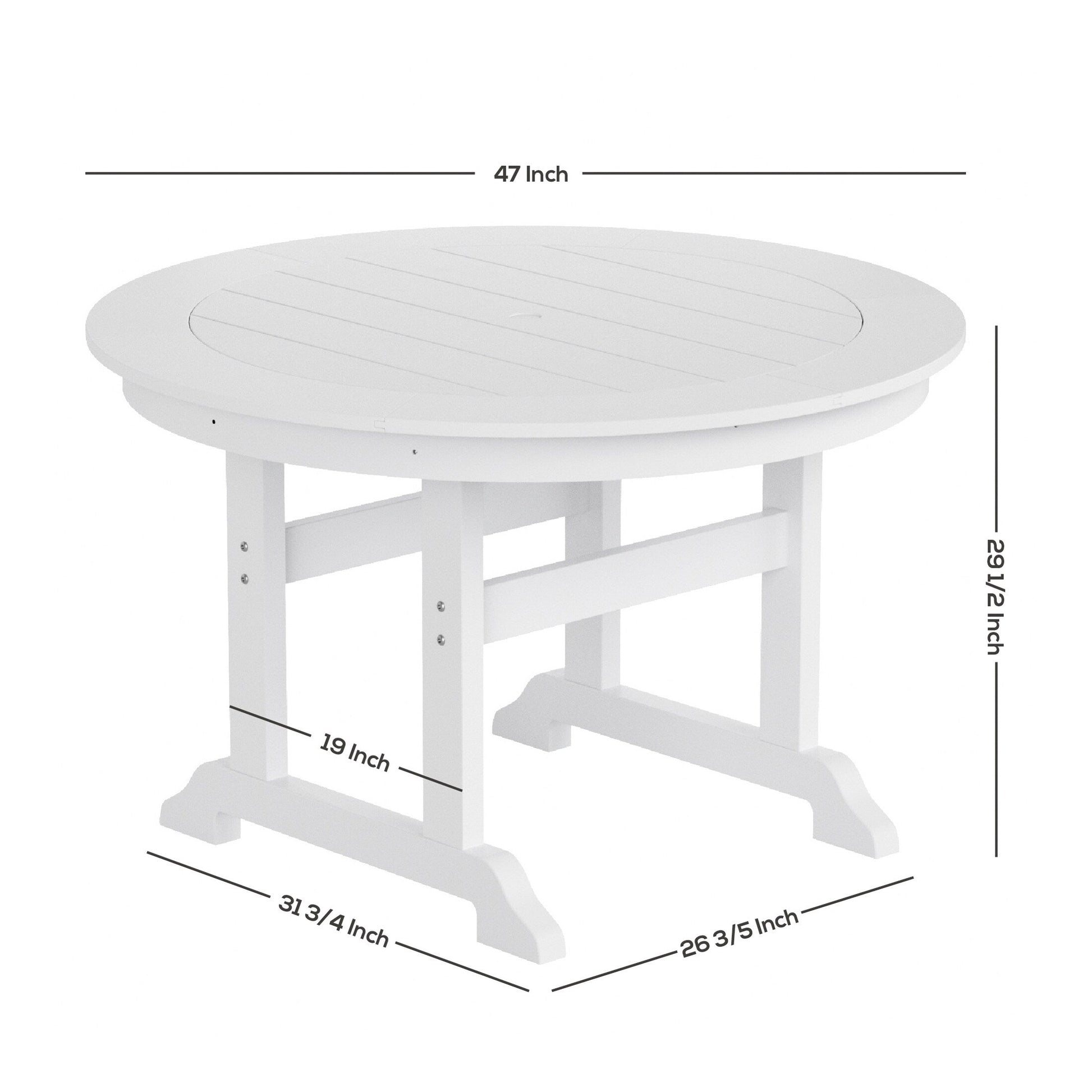 This traditional dining set brings friends and family together with its ample tabletop space, a durable frame, and attractive looks this set includes ?(1) Laguna Traditional Round Dining Table and (4) Armchairs. Our Laguna Round Dining Set with a heavy-duty construction made with our specially formulated HDPE and eco-friendly materials. Our HDPE is weather-resistant made to resist splits, cracks, rot, and peeling, for a lasting and attractive element you can enjoy for years to come. The sturdy frame features a slat-style tabletop for airflow not only trendy but functional. ?For added convenience, this table was made with a built-in umbrella hole (umbrella not included) to give you the option of shade cover from the blistering sun on a hot day. ?Whether you are entertaining guests or simply enjoying the outdoors this table will satisfy you for years to come.?