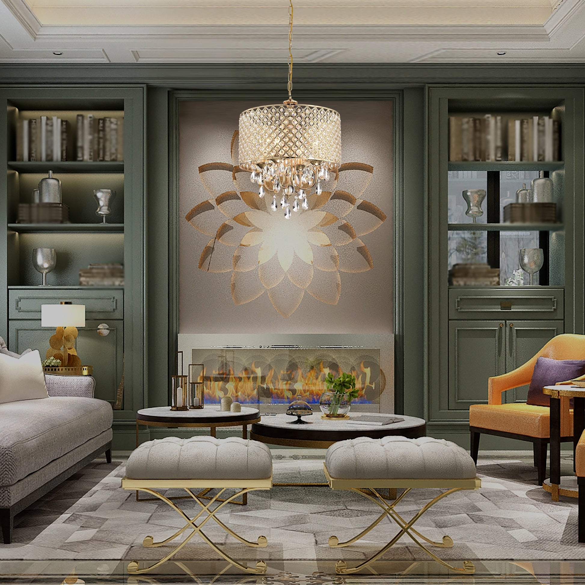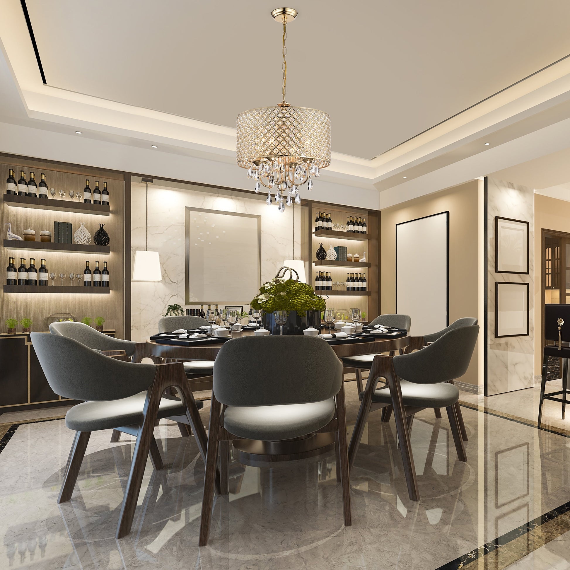 - 4-light chandelier: 17 in. Dia x 20 in. H with crystal hanging, Drum Dimensions: 17 in. Dia x 8.75 in. H