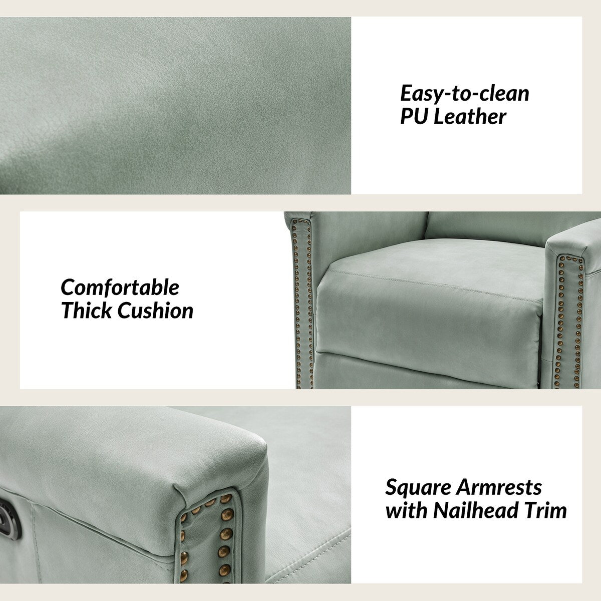 - Copper Nailhead Trim: Adorning the edges of the frame of the recliner set, the copper nailhead trim adds a touch of sophistication and refinement, accentuating the traditional charm of the recliner set and lending a luxurious aesthetic to the overall design.